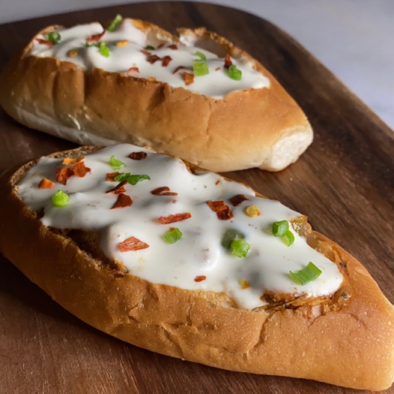 7- Olive paste na halloumi kukaanga kwa mafuta, nyanya za kukaanga na mint.