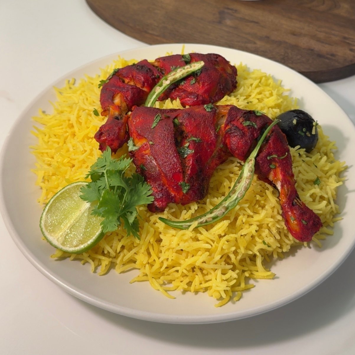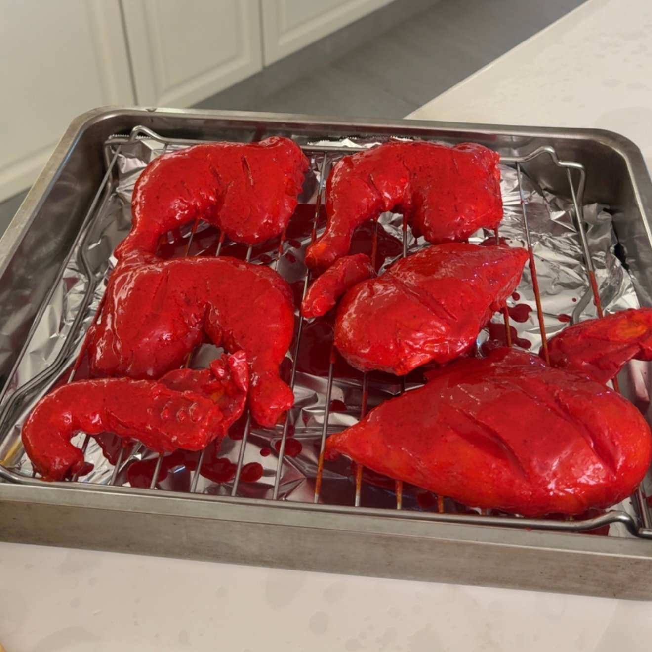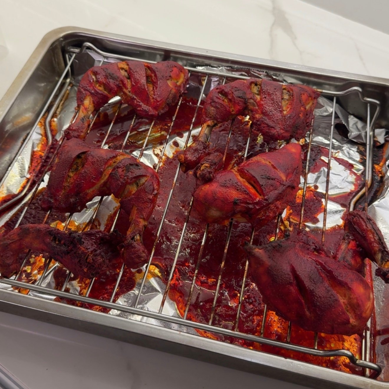 दही, लहसुन का पेस्ट, अदरक का पेस्ट, नमक, काली मिर्च, करी पाउडर, नींबू का रस, जैतून का तेल और खाद्य रंग को मिला लें।चिकन को बेकिंग ट्रे में रखें और ओवन में बेक करें: