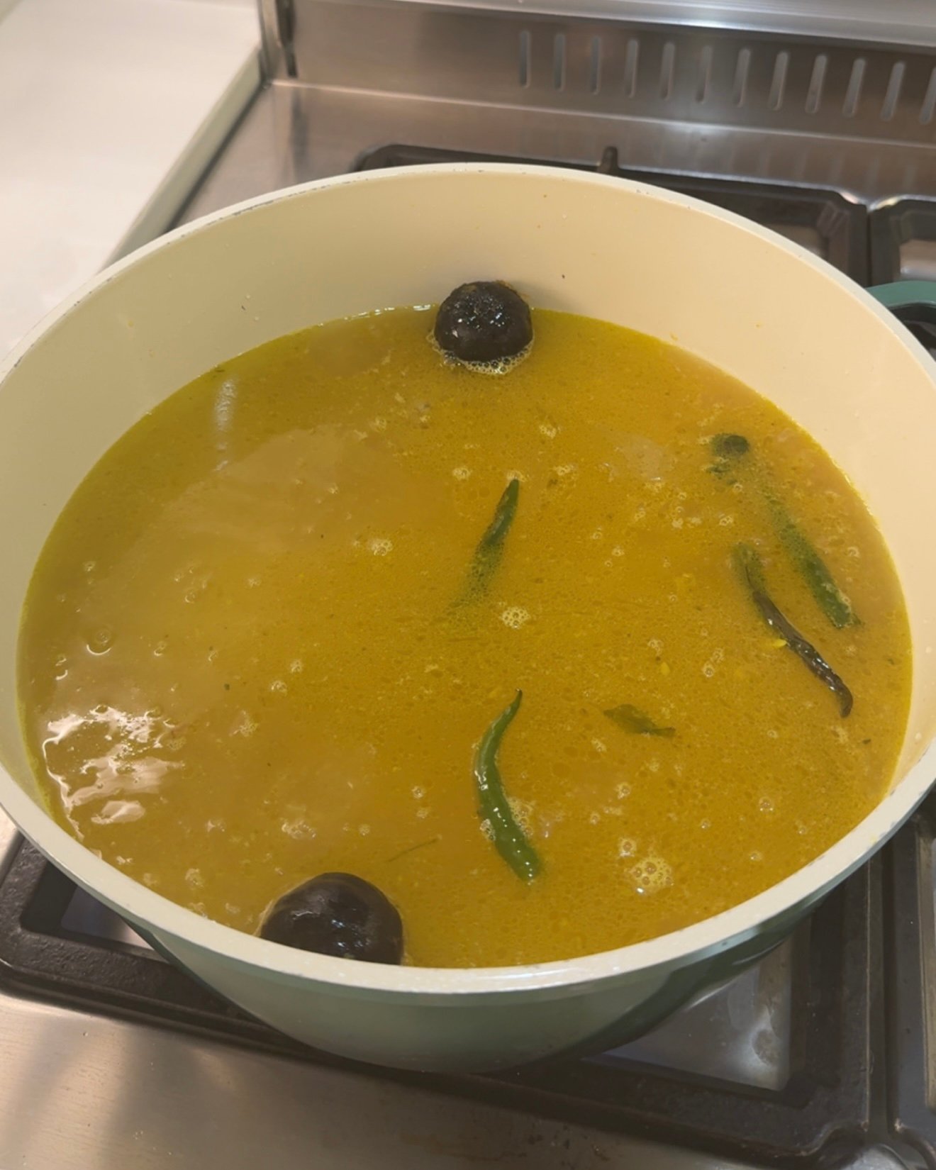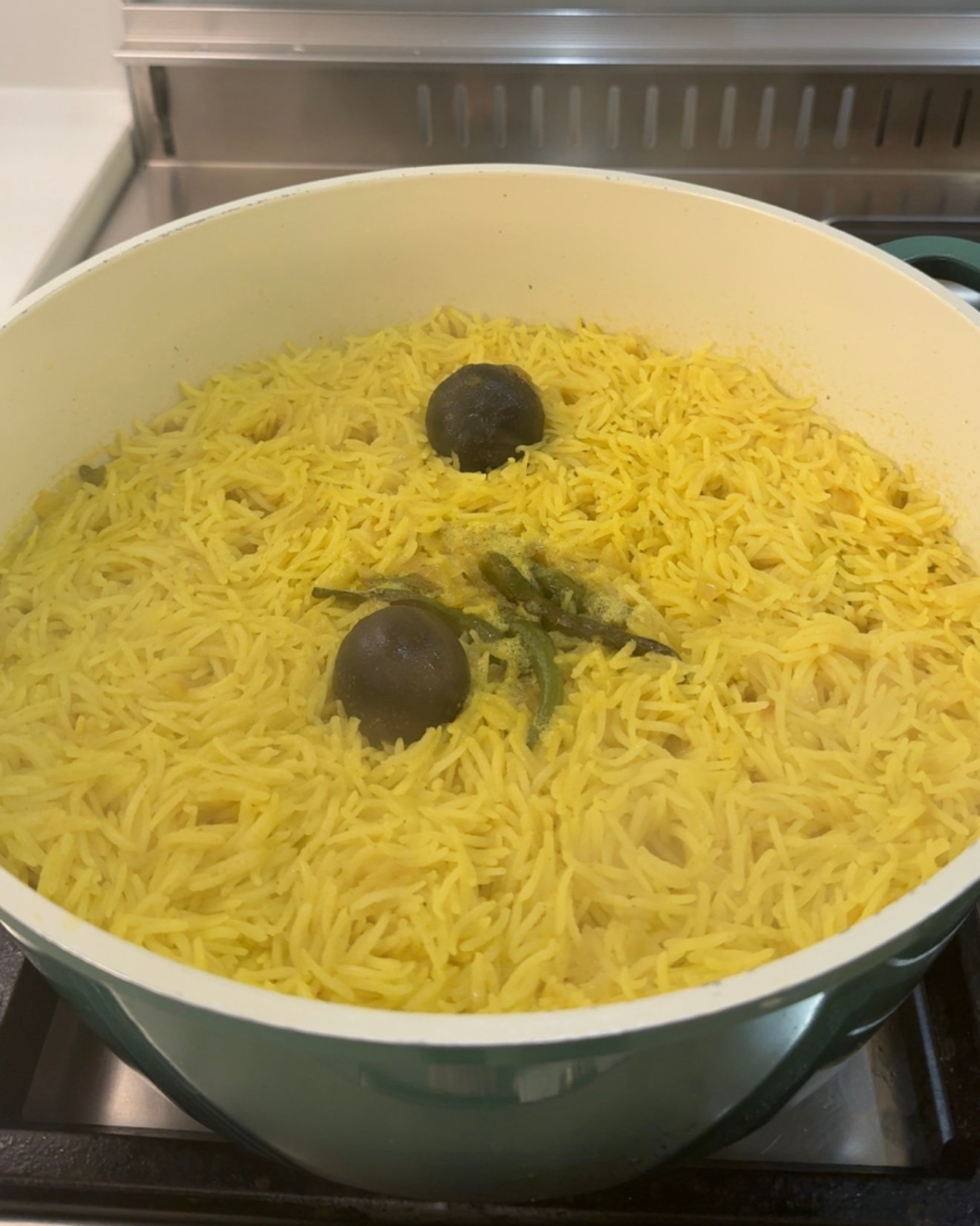 चूल्हे पर घी, प्याज, लहसुन का पेस्ट, अदरक का पेस्ट, मैगी, हल्दी, करी पाउडर, हरी मिर्च, करी पत्ते और सूखा काला नींबू डालें। अच्छी तरह मिलाएँ और नरम होने तक पकाएँ।