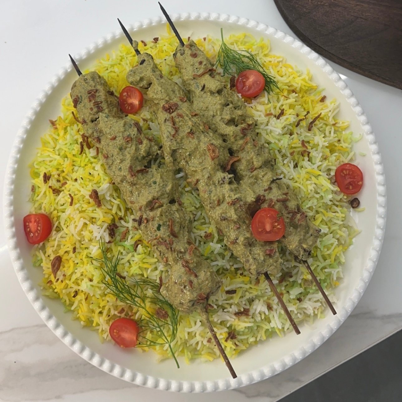 Untuk hiasan: kacang panggang dengan minyak zaitun, zareshk, dan ketumbar cincang.