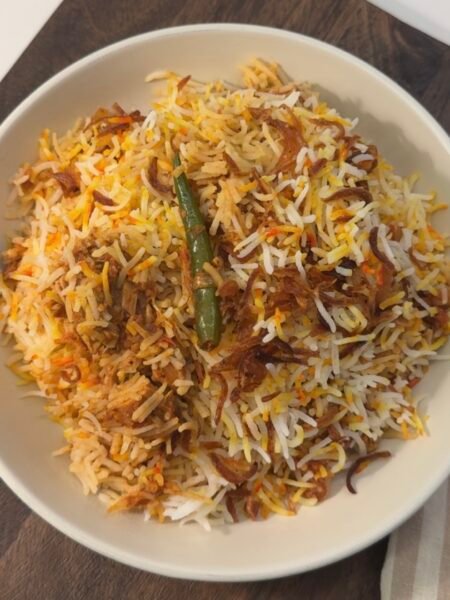Di atas api, tambahkan ghee, bawang, rempah-rempah utuh, dan jeruk hitam.