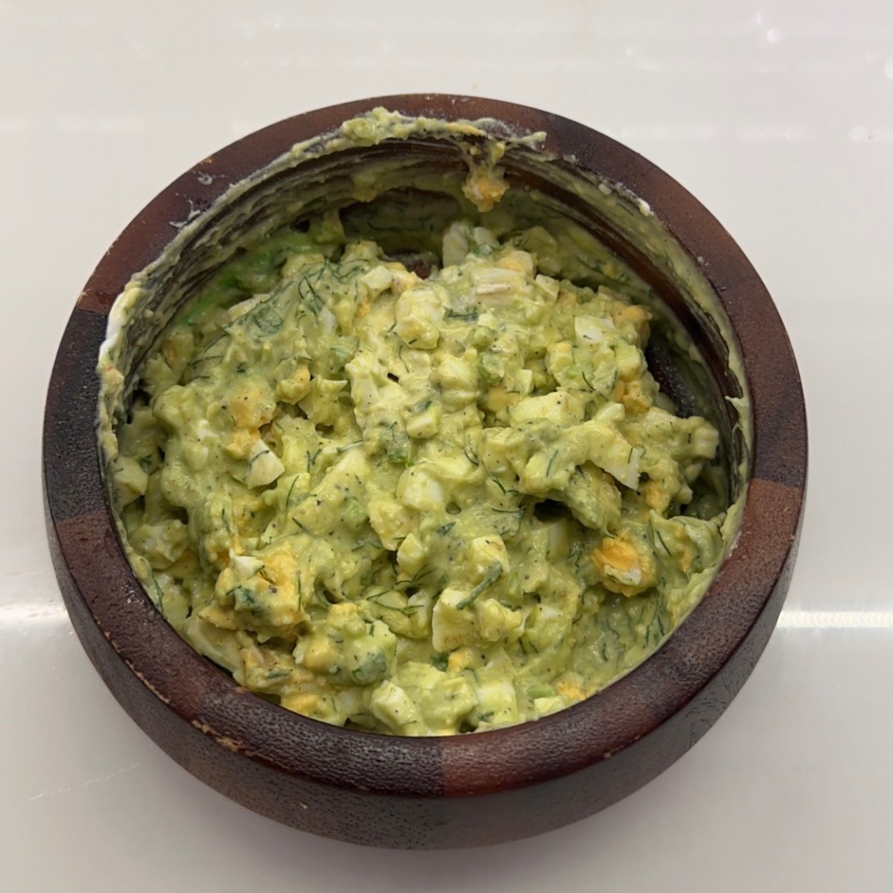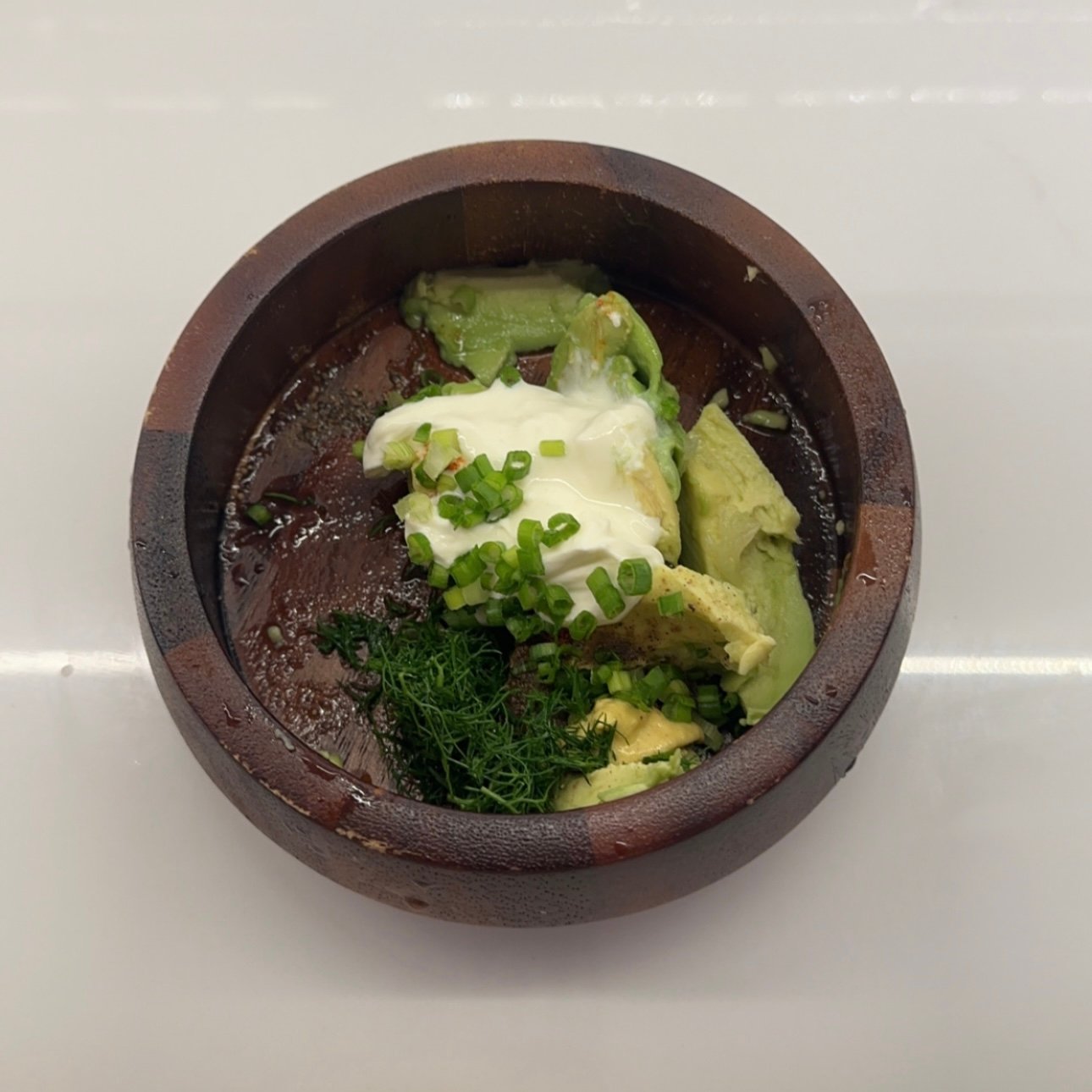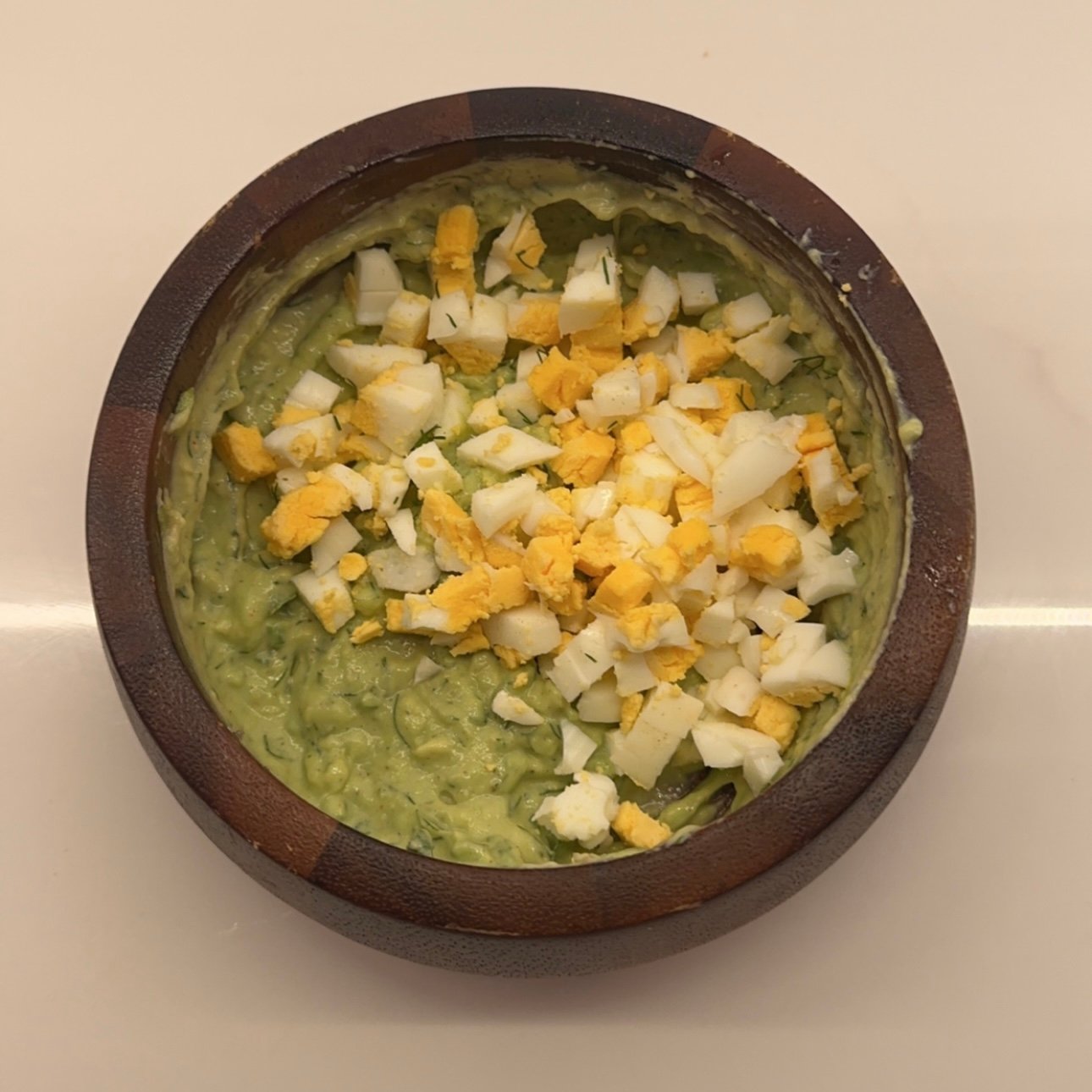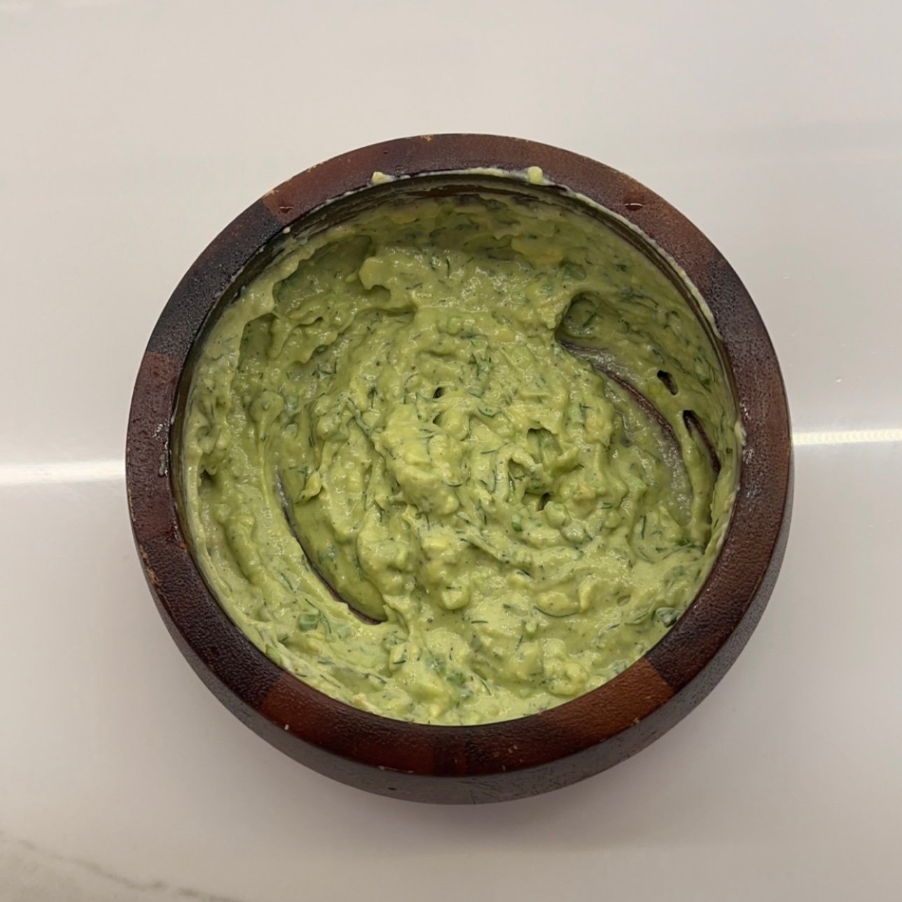 في وعاء، اخلط افوكادو، عصير ليمون، ملح، فلفل اسود، بابريكا، لبنه، خردل، شبت، بصل اخضر.