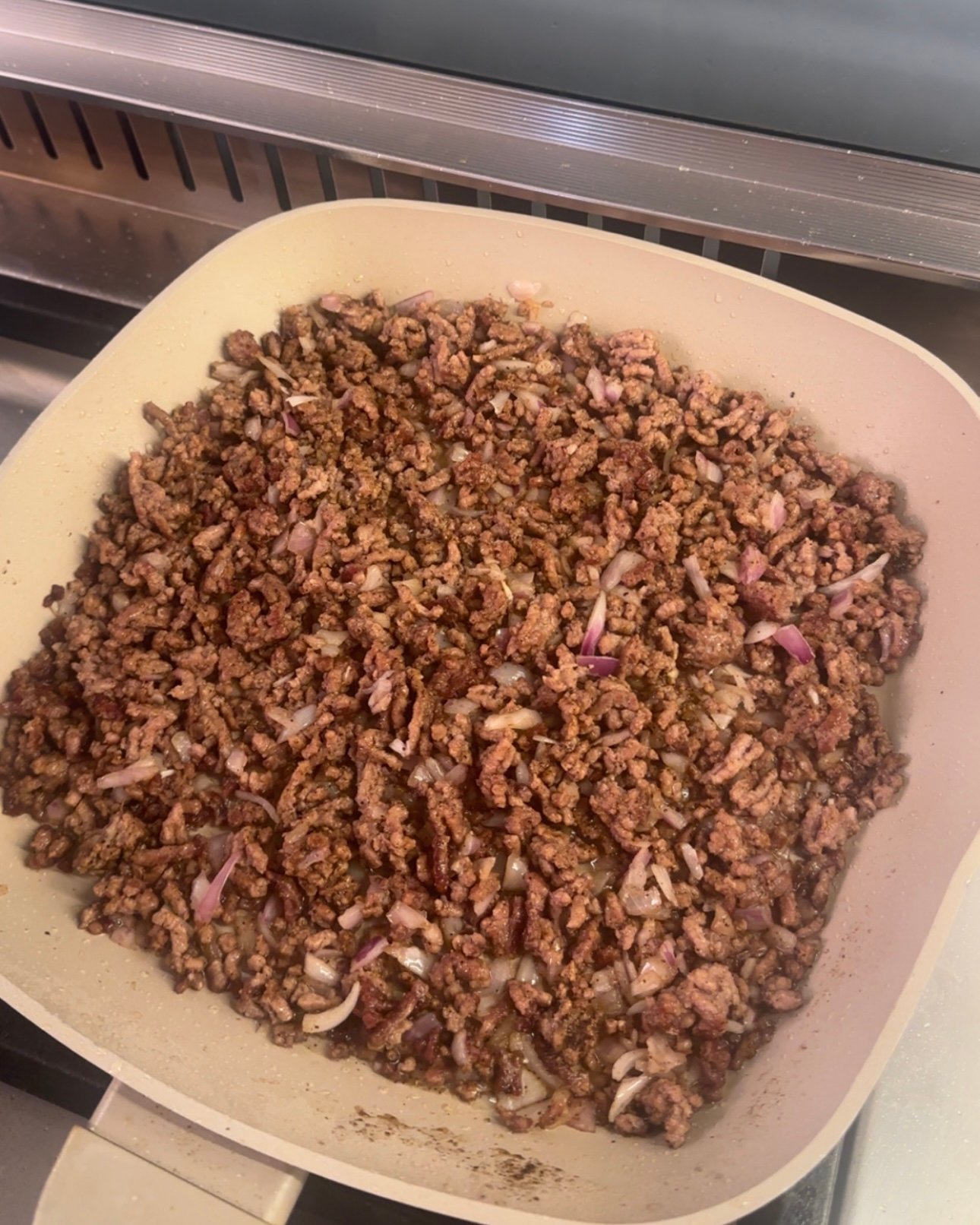 - على النار اضيف زيت زيتون، ثم اللحم واتركه ينضج.